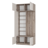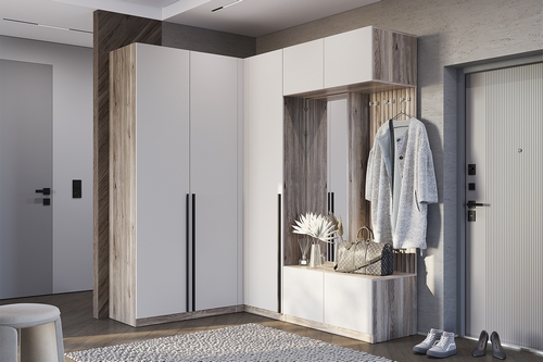 Особенности: Комплект мебели Урбан станет стильным и практичным решением для организации пространства в прихожей. Угловой шкаф Урбан ШКУ-06 состоит из отделения с продольной штангой и верхних и нижних ниш для хранения. Шкаф выполнен в Г-образной форме с одной створкой и к открытой части можно стыковать другие модули. Петли створки углового шкафа с углом открывания 180° оснащены доводчиком. Универсальная сборка позволяет устанавливать шкаф ШКУ-06 на обе стороны, адаптируя его под планировку помещения. Прихожая Урбан ПР-03 оснащена закрытыми полками для горизонтального хранения, что позволяет удобно размещать различные вещи. Верхние две полки с распашными дверцами подходят для хранения аксессуаров и головных уборов. Центральное отделение прихожей оснащено полками небольшой глубины с дверцей с зеркалом и открытым отделением с тремя крючками для повседневной верхней одежды. Нижняя тумба с распашными дверцами отлично подойдет для хранения обуви. Фасад прихожей декорирован реалистичной фотопечатью, имитирующей вертикальные деревянные рейки. Пластиковые крючки выдерживают нагрузку до 5 кг, что позволяет размещать на них верхнюю одежду или сумки. Толкатели с магнитом обеспечивают плавное закрывание дверок. Зеркало с еврокромкой добавляет функциональности и визуально расширяет пространство. Двухстворчатый шкаф Урбан ШК-03 оснащен полками, выдвижными ящиками и вертикальным отсеком со штангой. Петли створок оснащены доводчиком. Корпус и фасад выполнены из ЛДСП, что обеспечивает прочность и долговечность конструкции. Кромка толщиной 0,4 мм обеспечивает аккуратный и эстетичный вид. Накладная пластиковая ручка черного цвета добавляет шкафам современный и лаконичный вид. Опоры из пластика с подпятниками обеспечивают устойчивость и защиту напольного покрытия. Шариковые направляющие ящиков обеспечивают плавное и бесшумное открывание. Максимальная нагрузка на полку и штангу составляет 10 кг. Можно компоновать с другими элементами из серии мебели Урбан. Поставляется в разборном виде. Инструкция в комплекте.