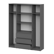 Особенности: Четырехдверный шкаф для одежды и белья Денвер в цвете графит с тремя выдвижными ящиками – это идеальное место хранения. Скрытая фурнитура. Направляющие роликовые. Штанга - 2 шт. Фурнитура в комплекте. Нагрузка на ящики 5 кг.