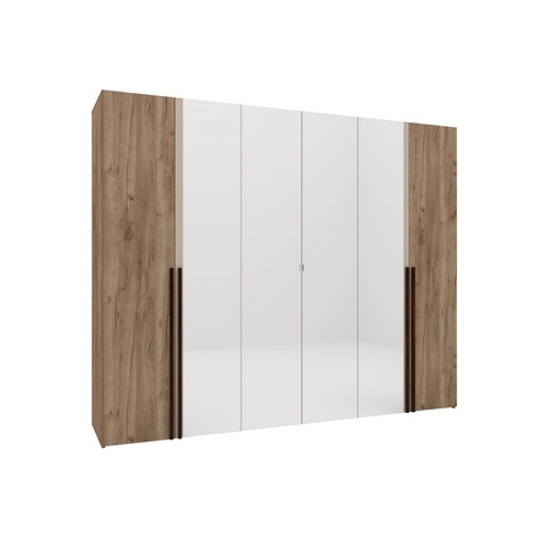 Особенности: Распашной 6-ти дверный шкаф для одежды и белья. Огранённые фацетом зеркала на фасадах шкафа в полный рост. Петли дверей с доводчиками. Высокие ручки из массива дерева. Опоры с возможностью регулировки. Крепится на стену за подвесы. Полки регулируются по высоте. Можно компоновать с другими модулями из серии мебели Кара.