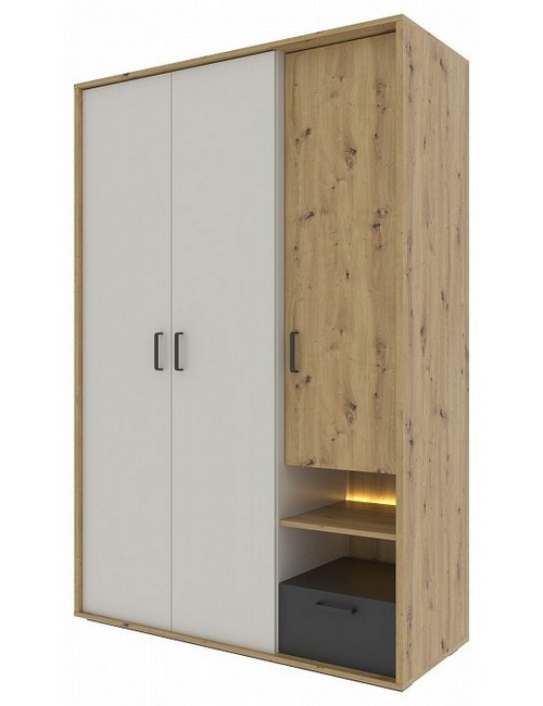 Ширина, см: 130. Высота, см: 195. Выступ, см: 52. Компоненты, входящие в комплект: 1 штанга для вешалок, 1 ящик, 3 дверцы, 7 полок. Стиль: модерн. Страна-производитель: Россия. Объем (м3): 0.167. Количество секций для хранения: 1. Основной цвет: разноцветная. Материал фасада: ЛДСП Е1. Материал корпуса: ЛДСП Е1. Тип поверхности корпуса: матовый. Дополнительное описание: В комплектацию входит светодиодная ленточная подсветка. Блок питания докупается отдельно. Место размещения: Пол. Помещение: Гостиная, Кабинет, Прихожая, Спальня. Гарантия (месяц): 24. Основное помещение: Гостиная. Цвет корпуса: дуб артизан. Цвет фасада: дуб артизан, серый, черный.