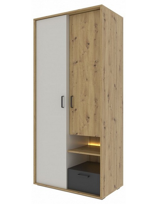 Ширина, см: 90. Высота, см: 195. Выступ, см: 52. Компоненты, входящие в комплект: 1 штанга для вешалок, 1 ящик, 2 дверцы, 6 полок. Стиль: модерн. Страна-производитель: Россия. Объем (м3): 0.147. Количество секций для хранения: 1. Основной цвет: разноцветная. Материал фасада: ЛДСП Е1. Материал корпуса: ЛДСП Е1. Тип поверхности корпуса: матовый. Дополнительное описание: В комплектацию входит светодиодная ленточная подсветка. Блок питания докупается отдельно. Место размещения: Пол. Помещение: Гостиная, Кабинет, Прихожая, Спальня. Гарантия (месяц): 24. Основное помещение: Гостиная. Цвет корпуса: дуб артизан. Цвет фасада: дуб артизан, серый, черный.