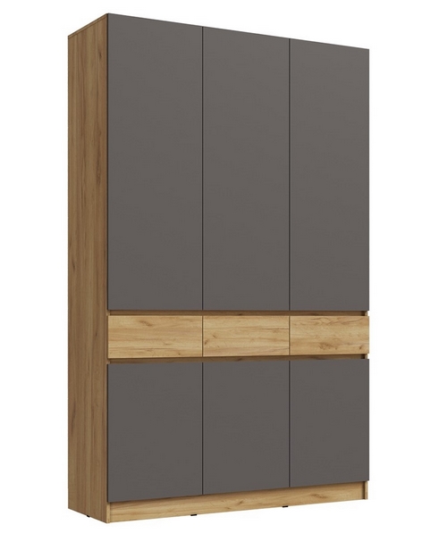 Особенности: Шкаф трехстворчатый Роджина (дуб крафт, графит) стильный и функциональный. Элегантный дизайн и современная отделка. Дверцы - распашные. Штанга для вешалок в комплекте Открывание дверей шкафа производится за дверцы фасада. Максимальная нагрузка на полку - 4 кг. Максимальная нагрузка на штангу - 10 кг.