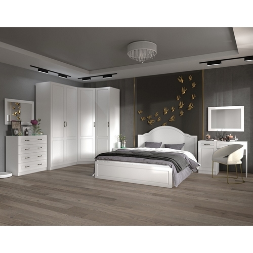 Особенности Спальни Апполия. Комплект 2: Корпус мебели выполнен из ЛДСП в белом цвете с тиснением. Фрезерованный фасад из МДФ в пленке ПВХ. Уточненные ручки и надежная фурнитура. Возможность укомплектовать шкафы карнизом. Классические ручки. Шариковые направляющие полного, плавного и бесшумного выдвижения на ящиках.