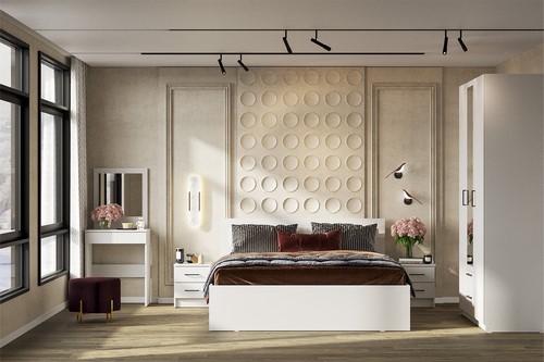 Особенности: Комплектация спильни бали - кровать с основанием 160х200 см, тумба прикроватная - 2 шт., шкаф распашной, стол туалетный. Размер спального места - 160х200 см. Основание под мастрас проложки ДСП, матрас в стоимость не входит и приобретается отдельно. Максимальная нагрузка для кровати 200 кг.