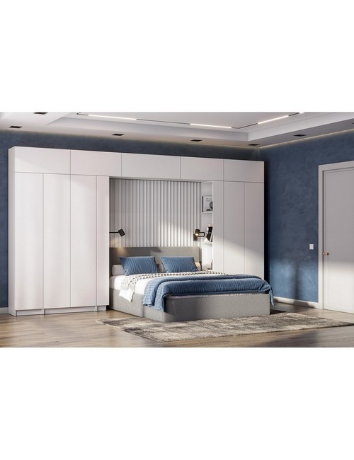 Технические характеристики: Спальня Бали комплект 4. Готовый гарнитур для спальни в современном светлом стиле, который создает целостное, функциональное и невероятно вместительное пространство для отдыха и хранения. Комплект включает: кровать с основанием 160x200 см, два шкафа двухстворчатых, два угловых окончания, четыре верхних шкафа 800, один навесной шкаф 1000 и узкий пенал. Двери распашные, на стальных накладных петлях. Направляющие ящиков - роликовые. Все элементы спроектированы как единая система, обеспечивая безупречное стилевое и размерное соответствие. Огромное количество модулей позволяет распределить всю одежду, белье, постельные принадлежности и личные вещи по категориям, освободив пространство комнаты. Спальня Бали комплект 4 - это продуманное до мелочей решение для тех, кто ценит порядок, светлую эстетику и желает получить готовую, стильную и невероятно функциональную спальню.