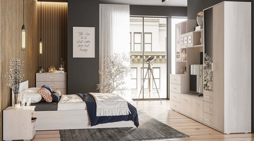 Комплектация: Центральная секция Белла, ясень белый (00-00103902), Шкаф 2-х дверный Белла, ясень белый (00-00103903), Комод Белла КМ-02 (00-00129992), Тумба прикроватная Белла ТБ-11 (00-00129995) - 2 шт., Кровать без основания Белла КР-11 140х200 (00-00129993).