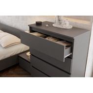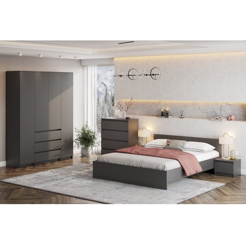 Особенности: Спальня Денвер (графит) идеально подходит для создания современного интерьера. Основными элементами спальни Денвер графит являются четырехдверный шкаф для одежды с ящиками, двуспальная кровать 160х200 см, тумба прикроватная, комод КМ 4 с четырьмя ящиками.