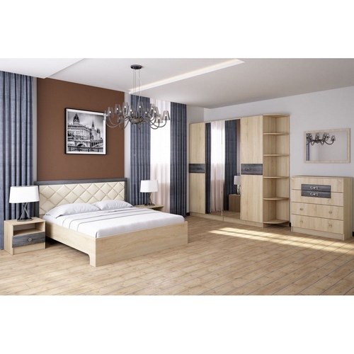 Размеры (см): Зеркало: ширина - 80, глубина - 2, высота - 55. Угловое завершение: ширина - 35, глубина - 53, высота - 220. Кровать: ширина - 157,7, глубина - 203, высота - 96. Тумба прикроватная: ширина - 45, глубина - 38, высота - 46. Комод: ширина - 82, глубина - 44, высота - 81. Шкаф 2-х дверный: ширина - 100, глубина - 55, высота - 220.