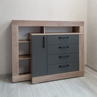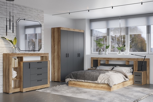 Особенности: Спальня Прима выполнена в приятном древесном оттенке корпуса и гармонично дополнен фасадами в цвете матового графита. Двуспальная кровать Прима с основанием 160х200 - это практичное и стильное решение для комфортного сна. Высокое изголовье кровати с нишами, которые можно использовать как небольшие полки, выглядит массивно и подчеркивает стиль лофт. Два 2-х створчатых шкафа для одежды и белья Прима оснащены широкой продольной штангой для деликатной одежды на плечиках и двумя полками. Две компактные прикроватные тумбы с двумя выкатными ящиками имеют оригинальную форму спинки соответсвующую высоте изголовья. Комод КМ-17 оснащен четырьмя выкатными ящиками и открытыми полками. На фасадах шкафов, комода и тумб установлены стильные ручки черного цвета. Для плавного открывания и закрывания, ящики оснащены шариковыми направляющими полного выдвижения. Небольшие опоры без ножек обеспечивают хорошую устойчивость комоду и шкафам. Матрас не входит в комплект и приобретается отдельно. Каркас из ЛДСП и фасад из МДФ обеспечивают прочность и долговечность мебели. Реальный цвет товара может отличаться от цвета товара на фотографии. Можно компоновать с другими модулями из серии мебели Прима.