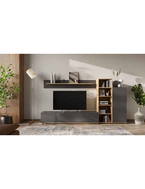 Технические характеристики: Стенка в гостиную Amazon (серый графит, дуб вотан). Современный мебельный гарнитур, создающий элегантную и функциональную зону хранения в гостиной. Модель отличается лаконичным дизайном, качественной фурнитурой и продуманной организацией пространства. Система открывания Push-to-Open для плавного бесшумного доступа. Механизм газлифт для легкости использования вертикальных фасадов, классические петли без системы доводки. Стабилизирующие пластиковые опоры высотой 2 см. Верхняя длинная полка для декоративных предметов не только расширяет пространство визуально, но и придает интерьеру завершенность и легкость. Открытый стеллаж позволяет разместить часто используемые вещи, любимые книги или элементы декора. Закрытый небольшой шкаф сохраняет атмосферу безупречного порядка и телевизионная тумба с тремя просторными отсеками для хранения. Стенка в гостиную Amazon гармонично сочетает современные технологии открывания, эргономичную организацию и нейтральную эстетику.