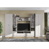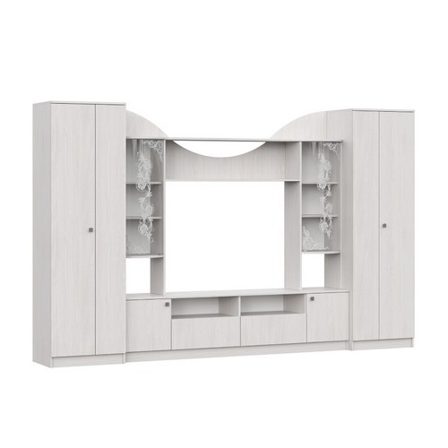 Дополнительно: Стенка в гостиную МГС 8 ясень анкор светлый имеет контрастное цветовое решение фасадов в сочетании с декоративными стеклами. Ниша под ТВ 1200x900 мм позволит установить телевизор с диагональю до 46 дюймов. Стеклостворки: гнутое прозрачное стекло с пескоструйным орнаментом. Петли без доводчиков. Направляющие ящиков: роликовые, без возможности установки доводчиков. Для безударного закрывания распашных створок их можно укомплектовать накладными демпферами. Для полного комплекта понадобится 6 демпферов.