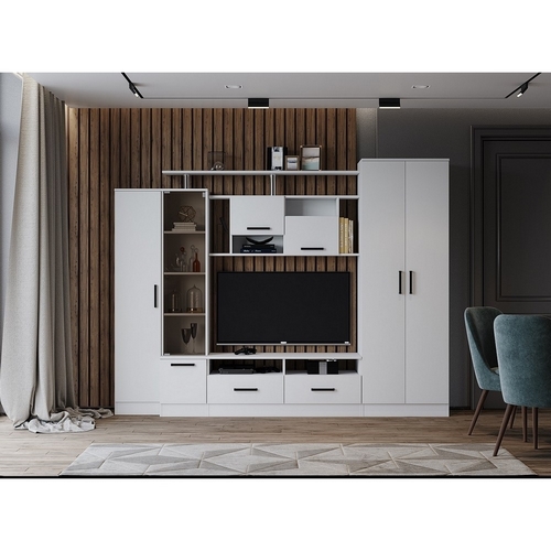 Особенности Стенки в гостиную Оскар-5: В комплект входит шкаф для одежды, закрытые и открытые полки, тв-тумба и закрытый стеллаж. Размеры ниши под телевизор - 75х115 см. Функциональность и комфорт при ежедневной эксплуатации.