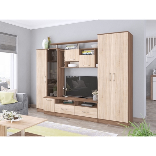 Особенности Стенки в гостиную Оскар-5: В комплект входит шкаф для одежды, закрытые и открытые полки, тв-тумба и закрытый стеллаж. Размеры ниши под телевизор - 75х115 см. Функциональность и комфорт при ежедневной эксплуатации.
