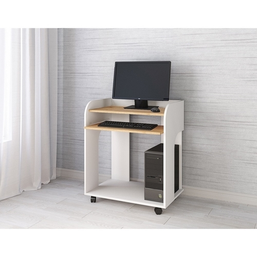 Особенности Стола компьютерного Грета-10: Оснащен компактной столешницей. Нижняя полка для процессора. Выезжающая открытая полка на роликовых направляющих для клавиатуры. Колесные опоры.