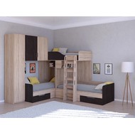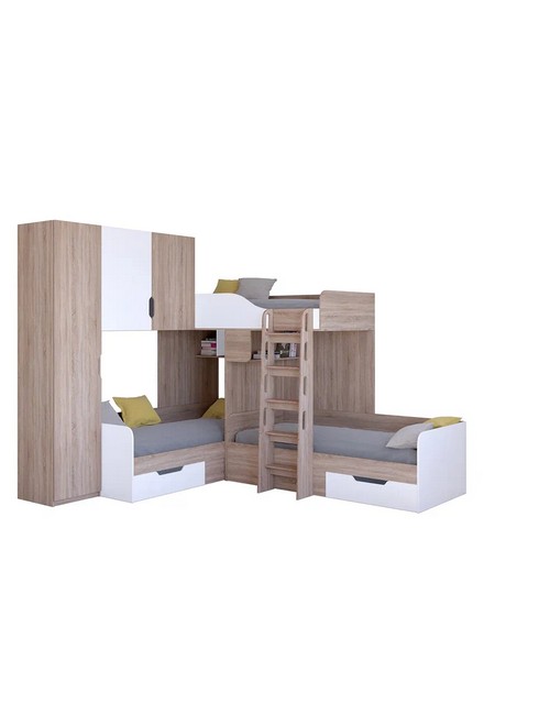 Технические характеристики: Трехместная кровать Трио 1 (сонома, белый). Инновационная трехместная модель Трио 1, созданная для комфортного размещения троих детей. Конструкция предусматривает три полноценных спальных места, что делает ее идеальным решением для многодетных семей или для детской комнаты, где необходимо оптимально использовать пространство. Кровать трехместная Трио 1 имеет надежные бортики безопасности на верхнем ярусе. Удобная и безопасная лестница для доступа, просторные вместительные ящики для хранения и платяной шкаф, который можно установить с любой стороны. Направляющие ящиков - роликовые. Максимальная нагрузка на спальное место - 100 кг. Трехместная кровать Трио 1 - идеальное решение для организации комфортного сна троих детей в одной комнате. Варианты цвета фасадов:дуб молочный, дуб шамони, орех, оранжевый, голубой, салатовый, розовый, белый, венге, железный камень, сонома. Для уточнения деталей рекомендуем проконсультироваться с нашими специалистами.