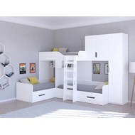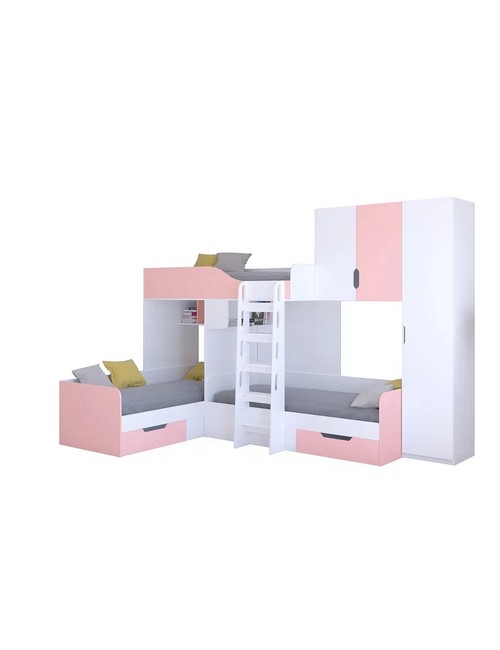 Технические характеристики: Трехместная кровать Трио 2 (белый, розовый). Инновационная трехместная модель Трио 2, созданная для комфортного размещения троих детей. Конструкция предусматривает три полноценных спальных места, что делает ее идеальным решением для многодетных семей или для детской комнаты, где необходимо оптимально использовать пространство. Кровать трехместная Трио 2 имеет надежные бортики безопасности на верхнем ярусе. Удобная и безопасная лестница для доступа, просторные вместительные ящики для хранения и платяной шкаф, который можно установить с любой стороны. Направляющие ящиков - роликовые. Максимальная нагрузка на спальное место - 100 кг. Трехместная кровать Трио 2 - идеальное решение для организации комфортного сна троих детей в одной комнате. Варианты цвета фасадов:дуб молочный, дуб шамони, орех, оранжевый, голубой, салатовый, розовый, белый, венге, железный камень, сонома. Для уточнения деталей рекомендуем проконсультироваться с нашими специалистами.