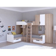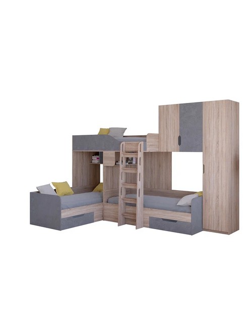 Технические характеристики: Трехместная кровать Трио 2 (сонома, железный камень). Инновационная трехместная модель Трио 2, созданная для комфортного размещения троих детей. Конструкция предусматривает три полноценных спальных места, что делает ее идеальным решением для многодетных семей или для детской комнаты, где необходимо оптимально использовать пространство. Кровать трехместная Трио 2 имеет надежные бортики безопасности на верхнем ярусе. Удобная и безопасная лестница для доступа, просторные вместительные ящики для хранения и платяной шкаф, который можно установить с любой стороны. Направляющие ящиков - роликовые. Максимальная нагрузка на спальное место - 100 кг. Трехместная кровать Трио 2 - идеальное решение для организации комфортного сна троих детей в одной комнате. Варианты цвета фасадов:дуб молочный, дуб шамони, орех, оранжевый, голубой, салатовый, розовый, белый, венге, железный камень, сонома. Для уточнения деталей рекомендуем проконсультироваться с нашими специалистами.