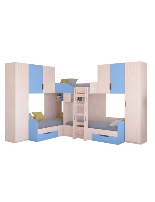 Технические характеристики: Трехместная кровать Трио 3 (дуб молочный, голубой). Инновационная трехместная модель Трио 3, созданная для комфортного размещения троих детей. Конструкция предусматривает три полноценных спальных места, что делает ее идеальным решением для многодетных семей или для детской комнаты, где необходимо оптимально использовать пространство. Кровать трехместная Трио 3 имеет надежные бортики безопасности на верхнем ярусе. Удобная и безопасная лестница для доступа, просторные вместительные ящики для хранения и два больших шкафа с каждой стороны. Направляющие ящиков - роликовые. Максимальная нагрузка на спальное место - 100 кг. Трехместная кровать Трио 3 - идеальное решение для организации комфортного сна троих детей в одной комнате. Варианты цвета фасадов:дуб молочный, дуб шамони, орех, оранжевый, голубой, салатовый, розовый, белый, венге, железный камень, сонома. Для уточнения деталей рекомендуем проконсультироваться с нашими специалистами.