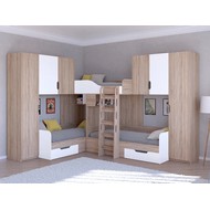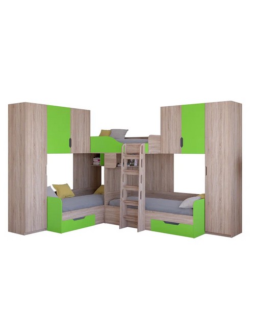Технические характеристики: Трехместная кровать Трио 3 (сонома, салатовый). Инновационная трехместная модель Трио 3, созданная для комфортного размещения троих детей. Конструкция предусматривает три полноценных спальных места, что делает ее идеальным решением для многодетных семей или для детской комнаты, где необходимо оптимально использовать пространство. Кровать трехместная Трио 3 имеет надежные бортики безопасности на верхнем ярусе. Удобная и безопасная лестница для доступа, просторные вместительные ящики для хранения и два больших шкафа с каждой стороны. Направляющие ящиков - роликовые. Максимальная нагрузка на спальное место - 100 кг. Трехместная кровать Трио 3 - идеальное решение для организации комфортного сна троих детей в одной комнате. Варианты цвета фасадов:дуб молочный, дуб шамони, орех, оранжевый, голубой, салатовый, розовый, белый, венге, железный камень, сонома. Для уточнения деталей рекомендуем проконсультироваться с нашими специалистами.