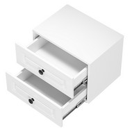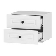 Особенности: корпус ЛДСП, белый, фасад МДФ, эмаль белая, задняя стенка - ЛДВП, белая 0,4 мм, кромка ПВХ пластик 0,7 мм, опоры подпятник, пластик, шариковые направляющие плавного выдвижения, стильные металлические ручки, max нагрузка на ящик - 5 кг